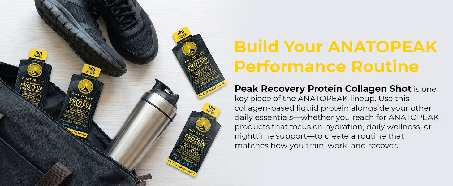 ANATOPEAK Peak Recovery Protein Collagen Shot is a collagen-based 18g protein pouch built for health & recovery—clean, efficient, and smooth delivery in a portable 1 fl oz. pouch.